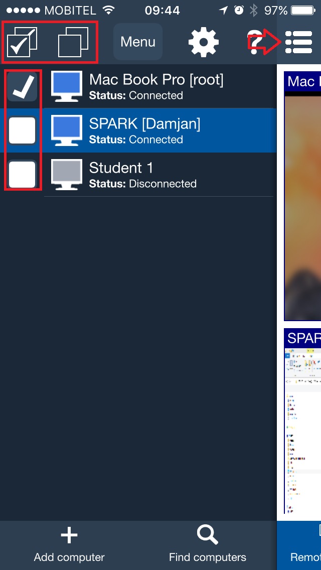 All added PCs will appear in a list. You can select one computer by tapping it. If you want to select more computers you can use checkboxes. Computer list can be hidden by tapping on menu icon.