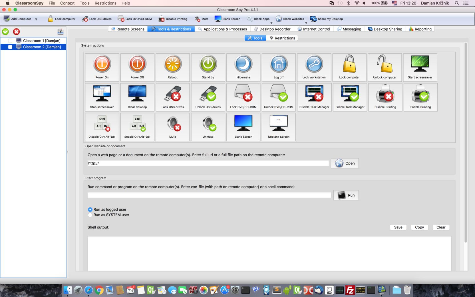 See Remote ScreensReboot, WOL, Shutdown, LockRecord DesktopBlock InternetLogging and KeyloggerShare DesktopSend MessageLock Computer, CD-ROM, USBLock ApplicationsOSX Desktop RecorderOSX ToolsOSX Processes